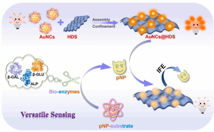 我院王冠男教授在传感器领域中科院一区杂志Sensors and Actuators: B. Chemical(IF 8.4)期刊发表了关于将金纳米团簇限制羟基双盐用于生物酶的多功能荧光传感的研究。在本研究中,通过静电限域策略制备了具有高量子产率(QY)和稳定性的固定化金纳米团簇 @层状双氢氧化物(AuNCs@HDS),并且首次对其进行了合理设计,用于对多种重要生物酶进行高效且通用的传感检测。这项工作具有以下特点。(1)AuNCs@HDS 是通过带负电荷的金纳米团簇(...