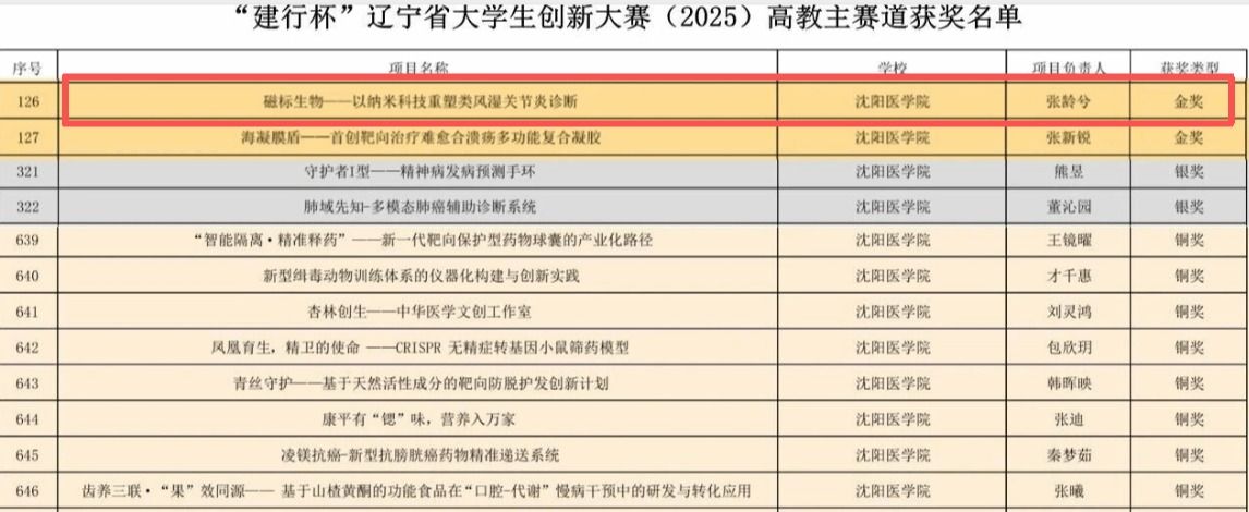 近日,由教育部、辽宁省教育厅主办的中国国际大学生创新大赛(2025)辽宁赛区决赛圆满落幕。在这场汇聚了众多高校精英学子、竞争激烈的创新盛宴中,我院2022级药学专业张龄兮同学凭借参赛项目“磁标生物—以纳米科技重塑类风湿关节炎诊断”脱颖而出,一举斩获辽宁赛区金奖,为学校和学院赢得了荣誉。