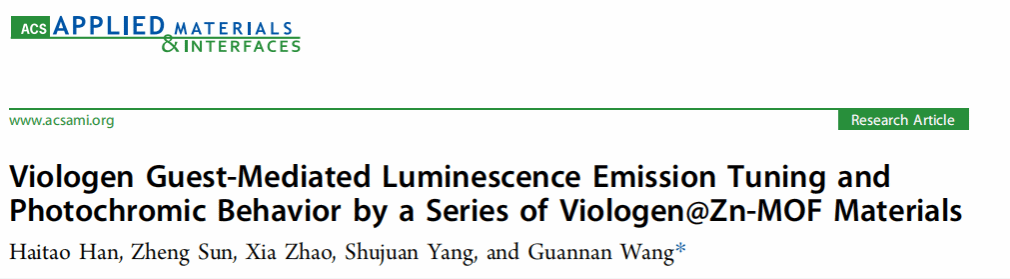 我院王冠男教授在化学领域中科院二区杂志ACS Applied Materials&Interfaces(IF 9.5)期刊发表了关于由MOF及系列紫精变体通过主客体作用的一系列 Viologen@Zn-MOF 材料及用于光致变色行为的研究。