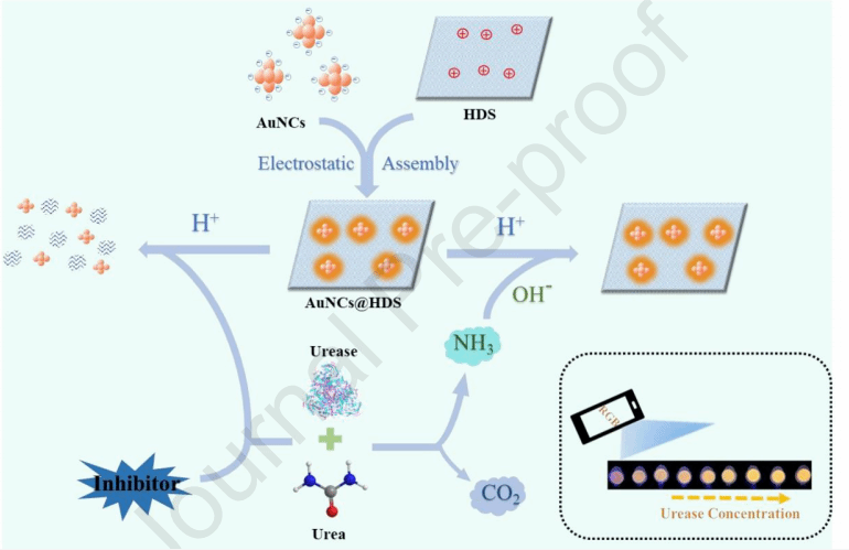 本研究制备了一种简单灵敏的荧光传感平台,用于检测尿素酶及其抑制剂。该荧光传感平台利用了由羟基双盐(HDS)诱导的金纳米簇(AuNCs)独特的荧光增强效应和尿素酶催化水解尿素的特异性。将H+诱导的AuNCs@HDS的荧光淬灭与尿素酶催化水解尿素产生的OH- 相结合从而实现 AuNCs@HDS 的荧光响应变化,并将其作为输出结果。实现了对尿素酶和尿素酶抑制剂的高灵敏度和精确的鉴定。根据传感平台对尿素酶的灵敏检测结果,该平台还被用于检测人体唾液样本中的尿素酶。检测结果 结果证实了传感平台在检测真实样本中的尿素酶的实用性和准确性。此外,还制备了一种基于AuNC@HDS的水凝胶试剂盒,用于便携式检测尿素酶。结果表明这项工作不仅为尿素酶相关的生化研究和便携式检测提供了有力的技术支持,也为构建基于 AuNCs@HDS 的传感器提供了启发。