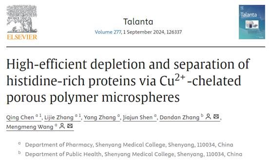 和沈阳市医药分子诊疗探针研发重点实验室的王蒙蒙博士在国际权威期刊《塔兰塔》(Talanta, 一区, IF: 5.6)上发表了铜螯合的多孔聚合物微球高效分离去除富组氨酸蛋白质的研究成果,题为“High-efficient depletion and separation of histidine-rich proteins via Cu2+-chelated porous polymer microspheres”。研究利用金属配体螯合材料SPSDVB-PAA-Cu对富组氨酸蛋白质进行了高选择性的分离纯化,并实现了复杂人血浆样本中高丰度蛋白质的去除。性爱影片