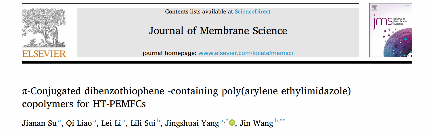 2025年12月,我院王进副教授与东北大学杨景帅教授课题组合作,在高分子科学一区期刊Journal of Membrane Science(IF:9.0)发表题为《π-Conjugated dibenzothiophene -containing poly(arylene ethylimidazole) copolymers for HT-PEMFCs》的论文。